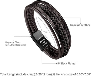 This men’s leather bracelet features a multi-layer braided design crafted from genuine cowhide leather. The rich brown leather paired with a sleek black magnetic clasp creates a timeless, masculine look that works well for everyday wear or special occasions.
