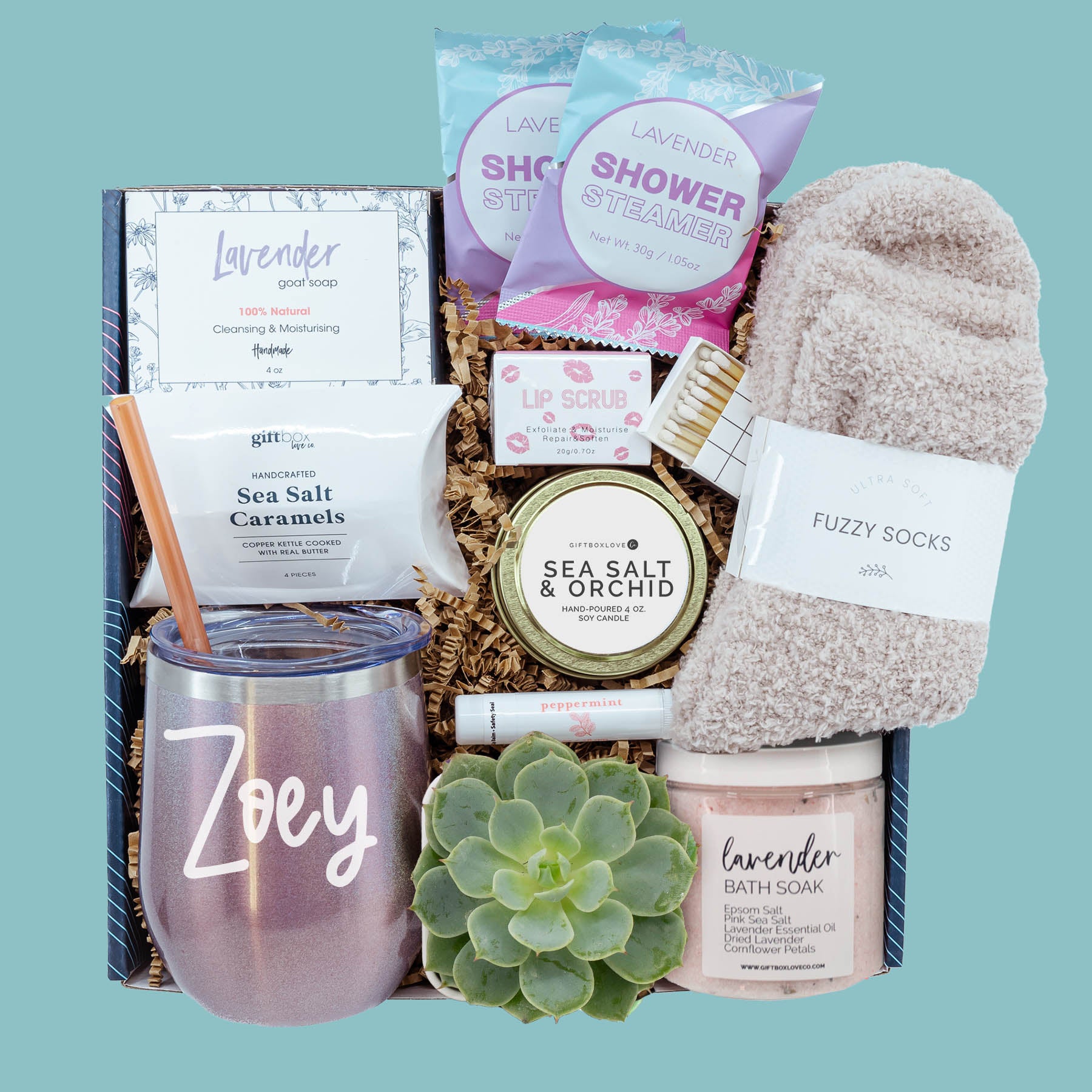 Elevate your gifting game with the perfect blend of utility, greenery, and serene ambiance with our Personalized Tumbler Gift Box, featuring a high-quality tumbler, soothing spa gifts, gourmet caramels, organic succulent and a 4 oz hand-poured soy wax candle – our best-selling Sea Salt and Orchid scent. This gift box is expertly curated to suit all occasions, making it an ideal present for birthdays, anniversaries, housewarmings, or even as a self-care treat.
