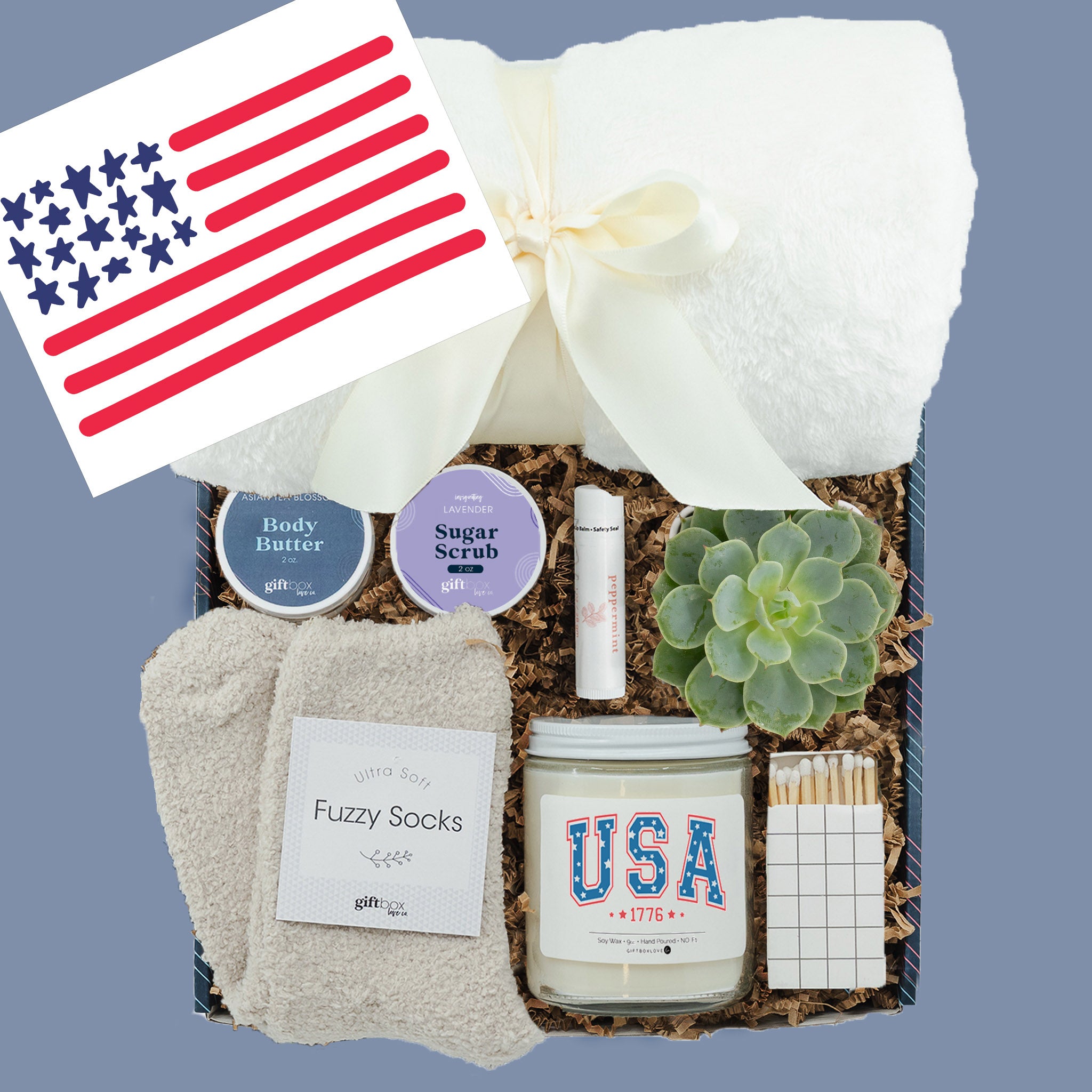 Celebrate independence and indulgence with the Fourth of July Glow & Cuddle Gift Box. Designed to pamper and uplift, this patriotic set is the perfect way to show appreciation or treat yourself with cozy comfort and a touch of sparkle.