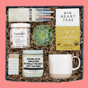 Brighten your boss’s day with the Sunshine and Smiles Boss’s Day Box. Filled with cozy comforts, uplifting tea, and a playful candle, this gift is the perfect mix of appreciation and humor. Designed to celebrate leaders who make a difference, it’s a thoughtful way to say thank you while sharing a smile.